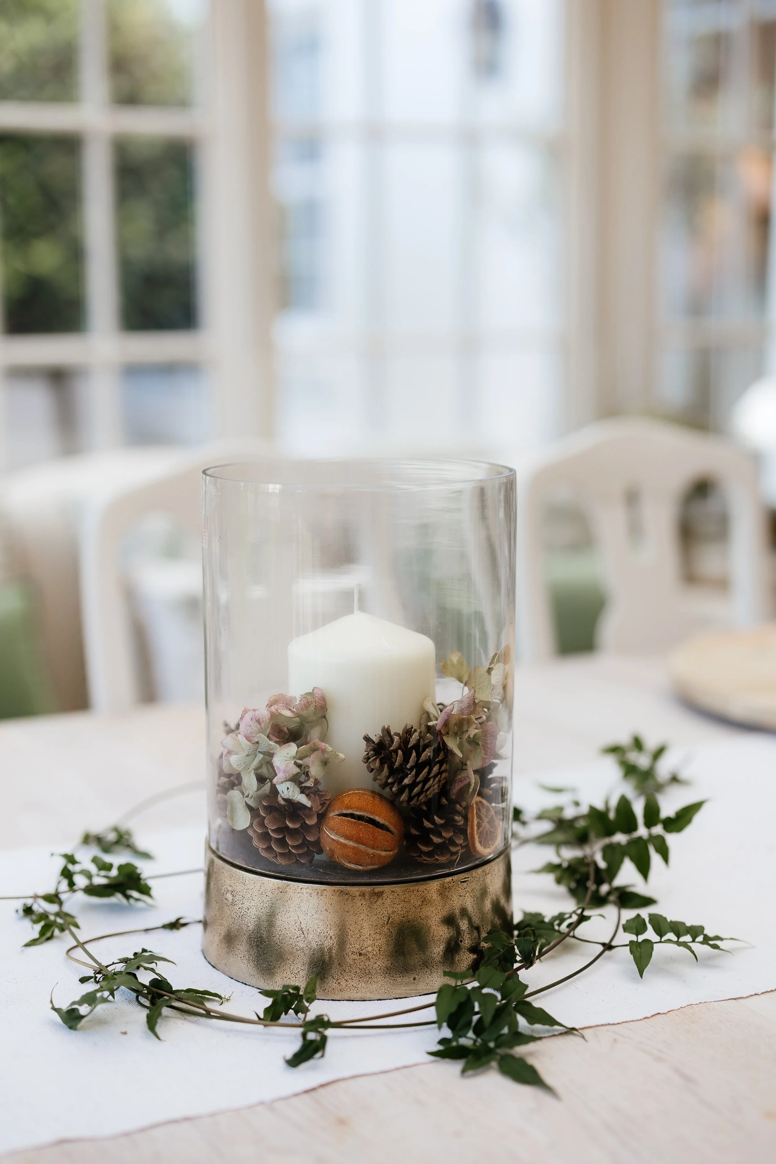 This hurricane lantern is all about easy elegance! With simple glass and a rich, brass-toned base, it brings a warm, rustic vibe. The base's unique, slightly imperfect texture adds extra charm. Available in two sizes—small (26 x 18 x 18cm) and large (31 x 21 x 20cm)—they're perfect for indoor or outdoor use. Try grouping different sizes for a cozy glow. Just add a pillar candle to complete the look—or, like us, pop in some dried Christmas decorations for a festive touch!