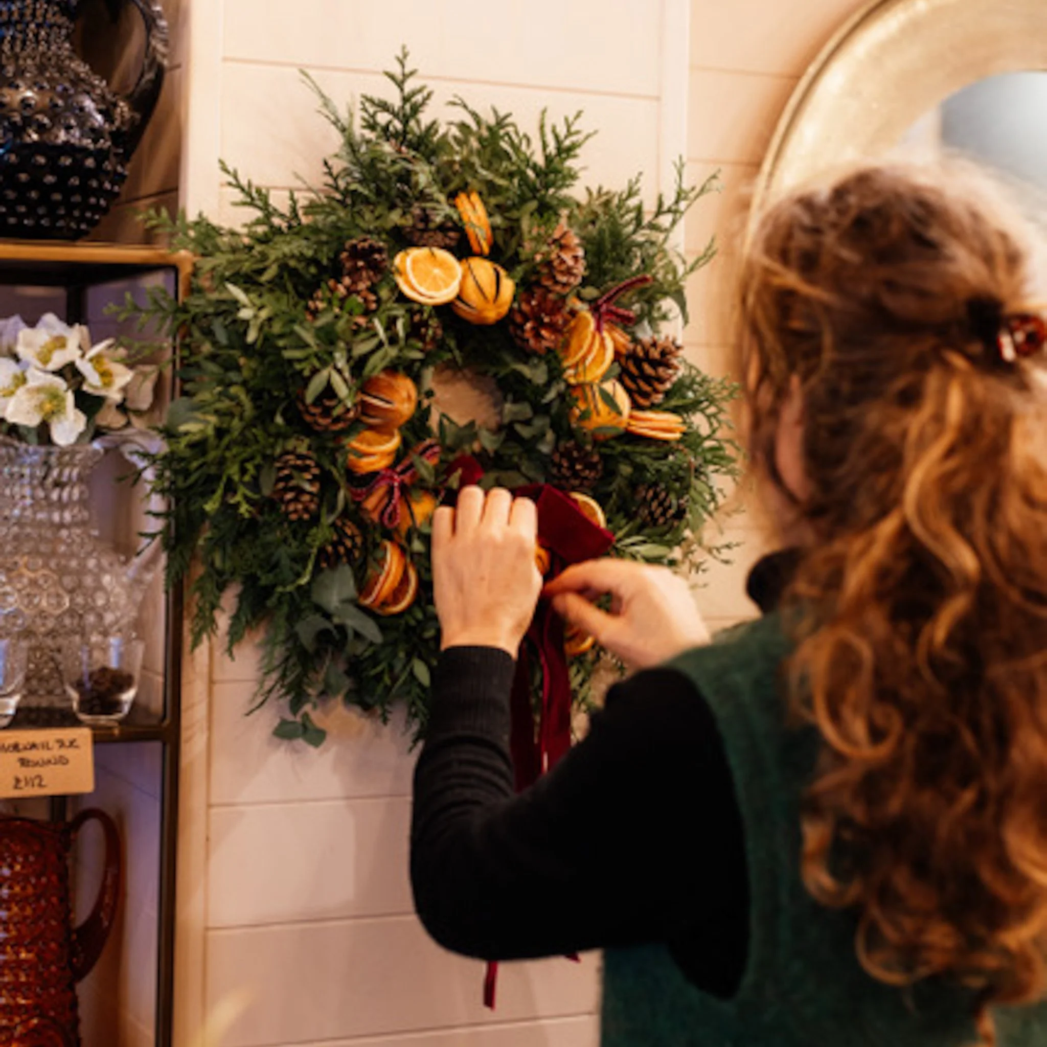 Gather a mix of seasonal decor like: dried fruits like oranges or apples, cinnamon sticks, cones, hydrangeas, baubles, ribbon